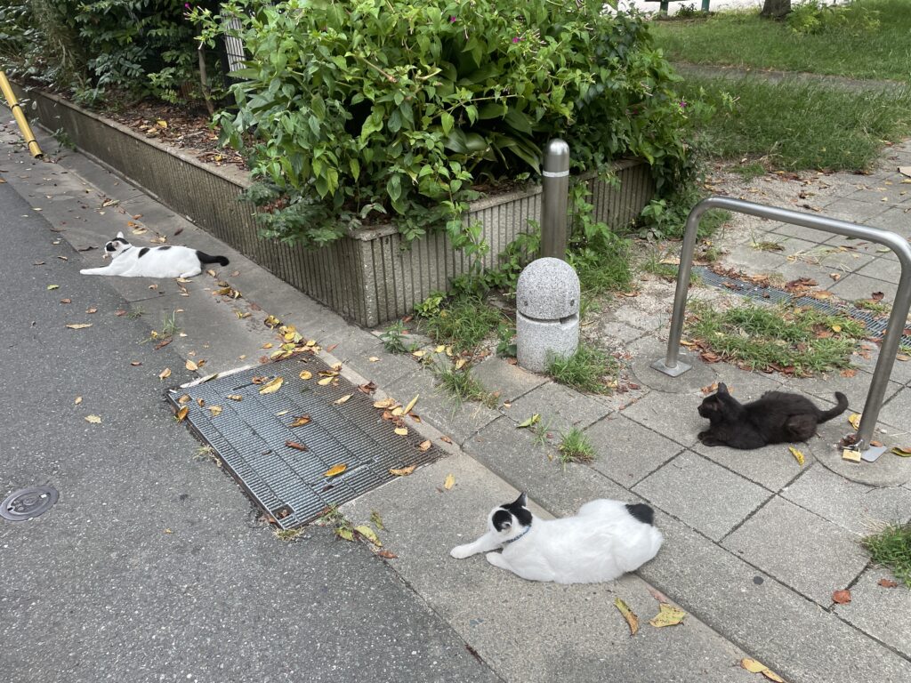 徒歩で食料買い出しに行っていると、公園前で家の中のようにひっくり返っている猫たちです。やや涼しい、と。昼は、まだまだ暑いのですが夕方は蒸し蒸しで気温だけは少し下がっています。