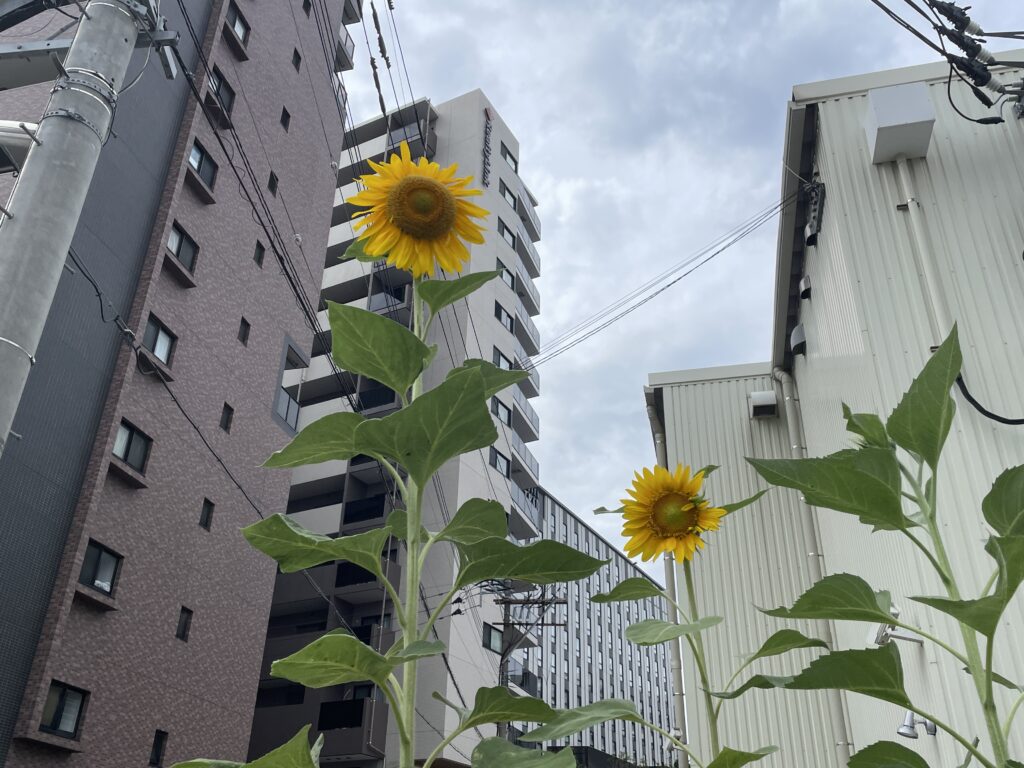 都会のひまわりです。シナリオを書いて、編集をして外に出ました。サンドイッチの材料を買う為。オンライン授業7回目まで順調に進みました。皆様ここまで本当にありがとうございました。