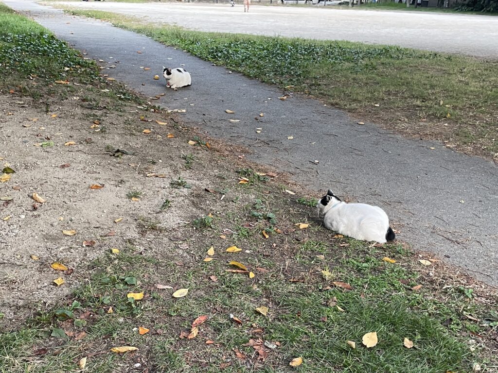 オンライン講座は初めて定員5名に達しています。30代から60代の皆様がご参加。女性2名、男性3名です。夕方。講座の前に買い物に出ると公園に太った牛のような猫です。