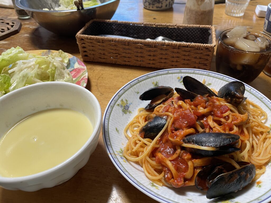 精進料理3日目。朝と昼(しらたまぜんざい。アオサの焼きおにぎり)おやつ(豆乳ミルクティ。お煎餅。安納芋の黒胡麻かけ)夜(ロメインレタスときのこの豆乳パスタ)