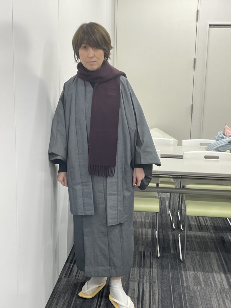 日本を代表する洋画家、岡田三郎助アトリエがロケ場所でもありますが、岡田先生を意識して、夢野三郎役の私も和服でいくことに決めました。雪駄も準備できて足元も完成。初稽古に滑り込んだのです。