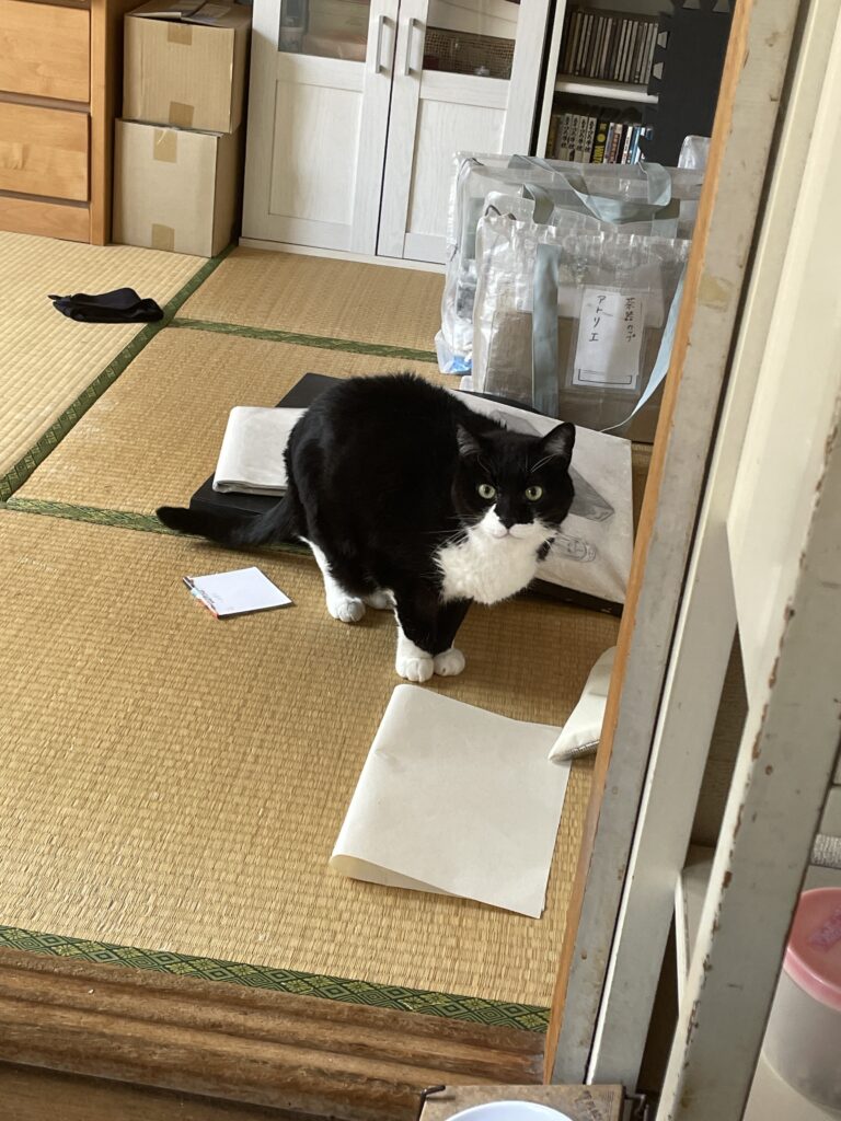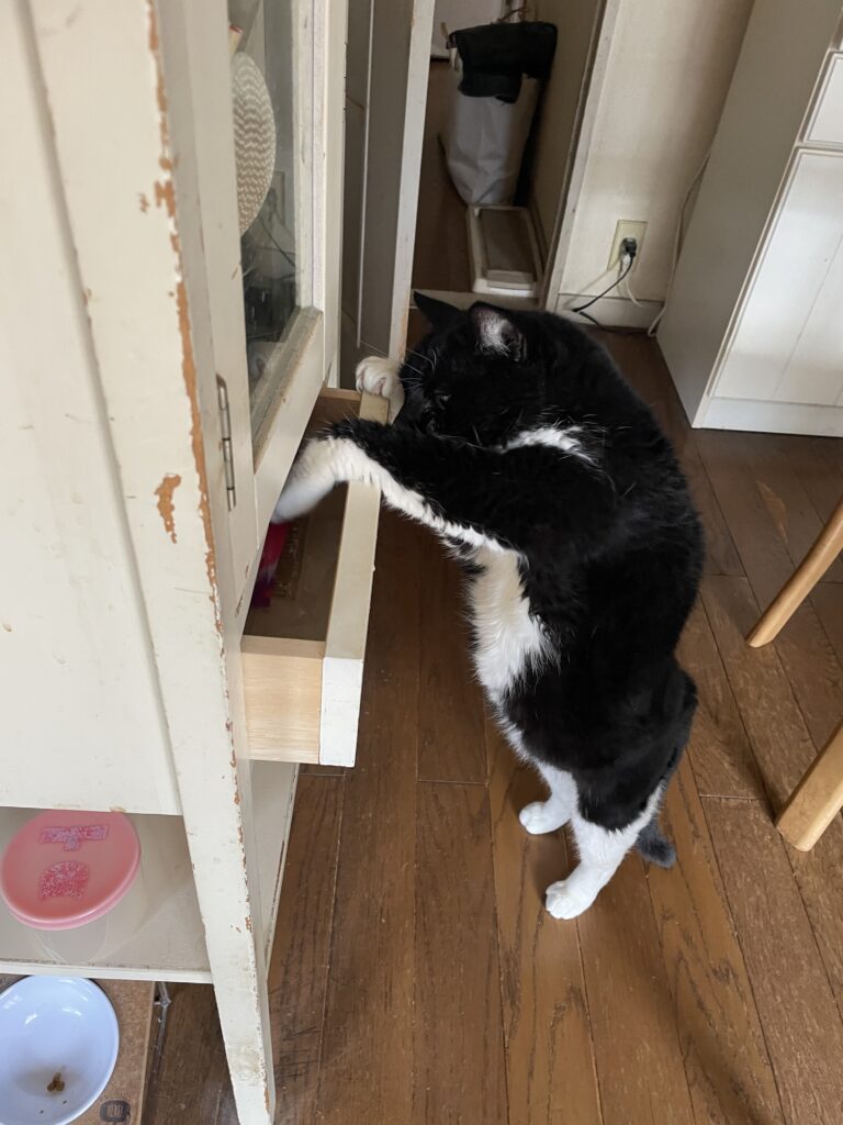 引き出しに隙間が空いてたんでしょう。鰹節の袋を器用に引き寄せていたのです。進化の瞬間だと思います。ニャーと言ってねだったりせず自力で直立し手先を器用に動かしているのです。