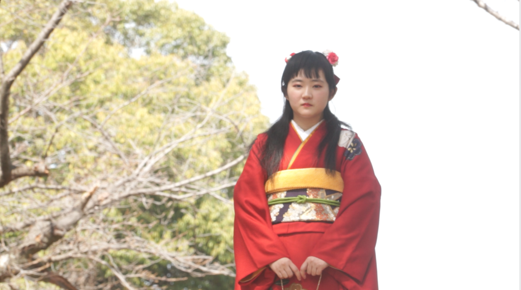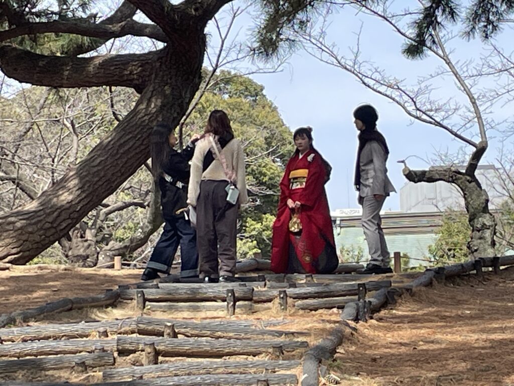 千葉から友人ノリノリも着付けにやってきてくれて、スタッフ Yuko家の振袖を真子役の真鈴さんに。桜はまだですが天気が良く、夢野役で振袖の真子を見上げる私にも感動がありました。