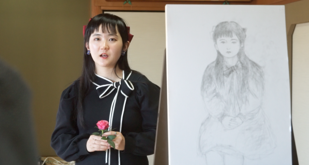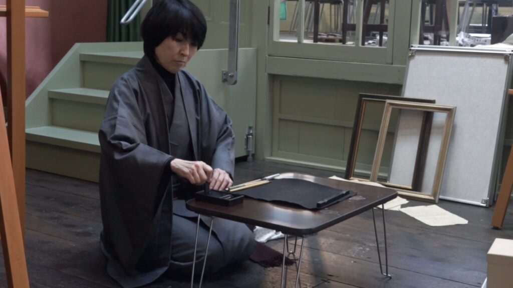 夢野の絵画を見つめる真子。絵画をそっと撫でています。真鈴さんの表情には抒情的な影が現れてきました。
