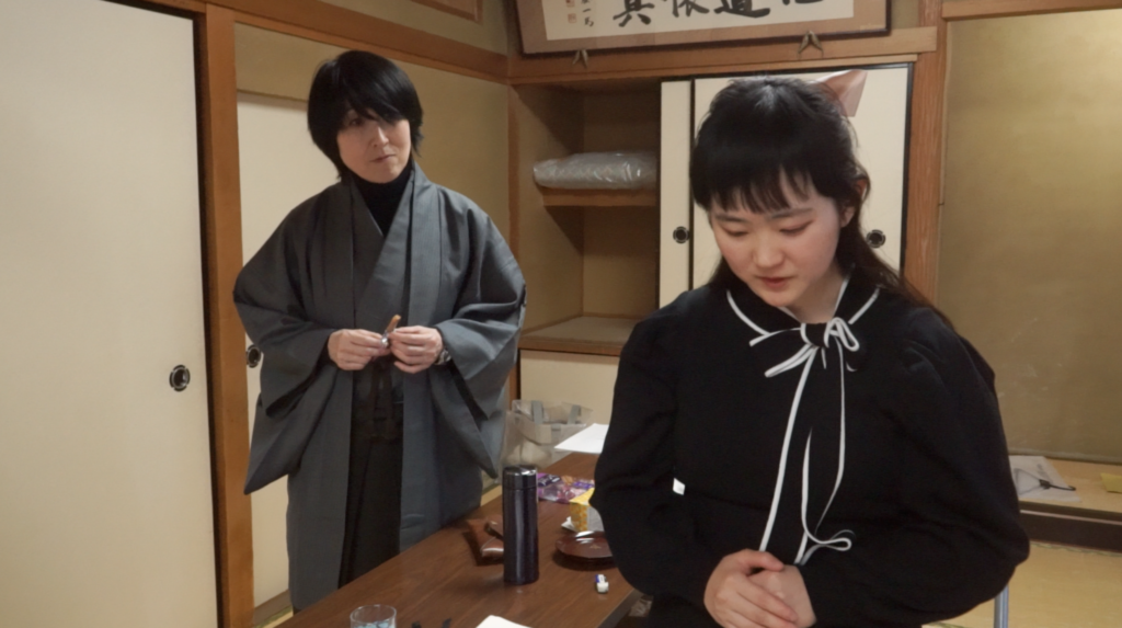その後、室内で稽古。市民センター茶室をお借りしましたが、良い雰囲気ですね。昭和のドラマみたい。こちらの撮影日も今月末に控えています。真子役の真鈴さんと夢野役の私と息を合わせている真っ最中です。
