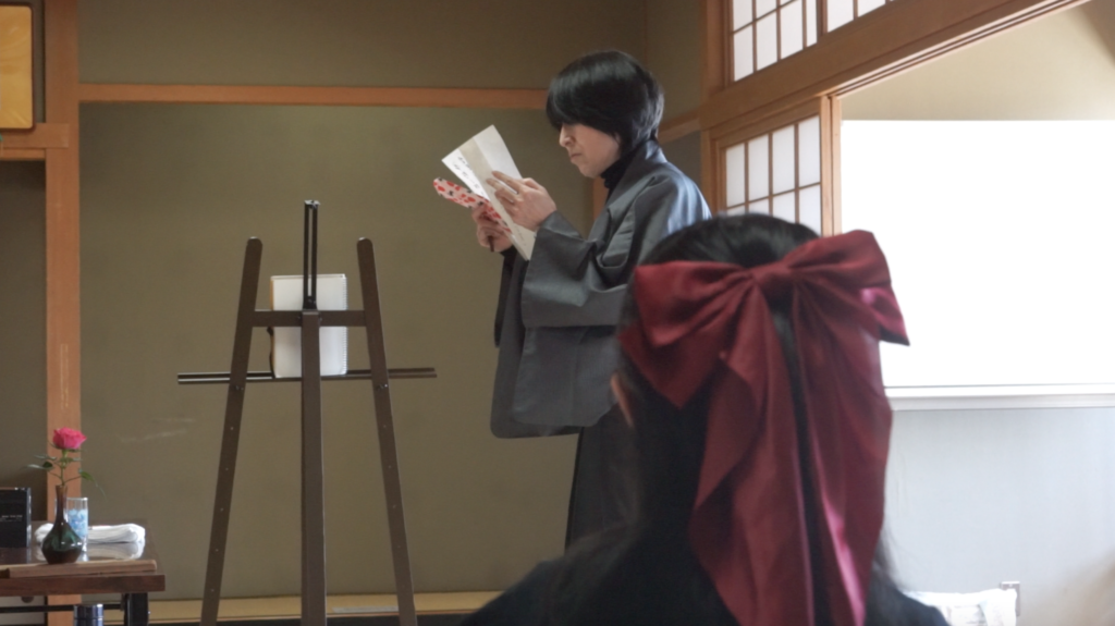 日本を代表する洋画家、岡田三郎助アトリエがロケ場所でもありますが、岡田先生を意識して、夢野三郎役の私も和服でいくことに決めました。雪駄も準備できて足元も完成。初稽古に滑り込んだのです。