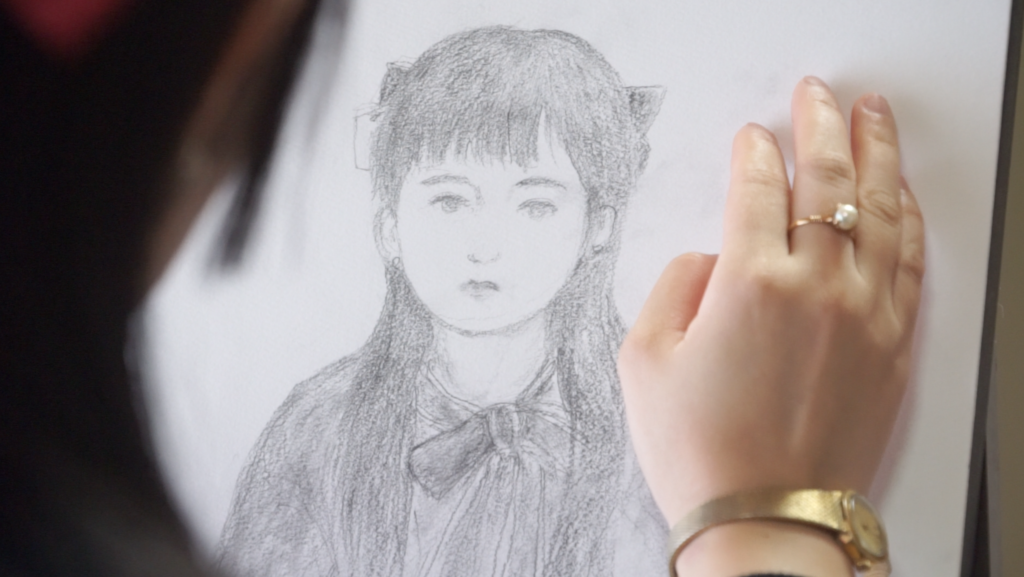 アクセサリーや時計も加えて、真子役を形にしていきます。自身の肖像を眺める真子の手元。